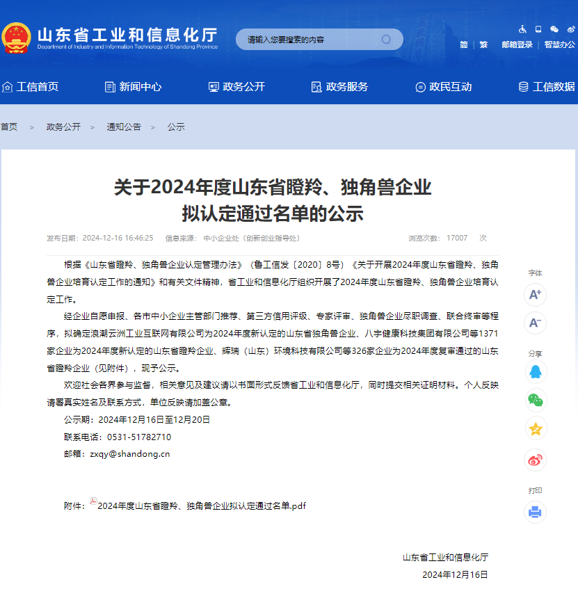2024年12月16日,煙臺國工智能科技有限公司獲評2024年度新認定的山東省瞪羚企業。