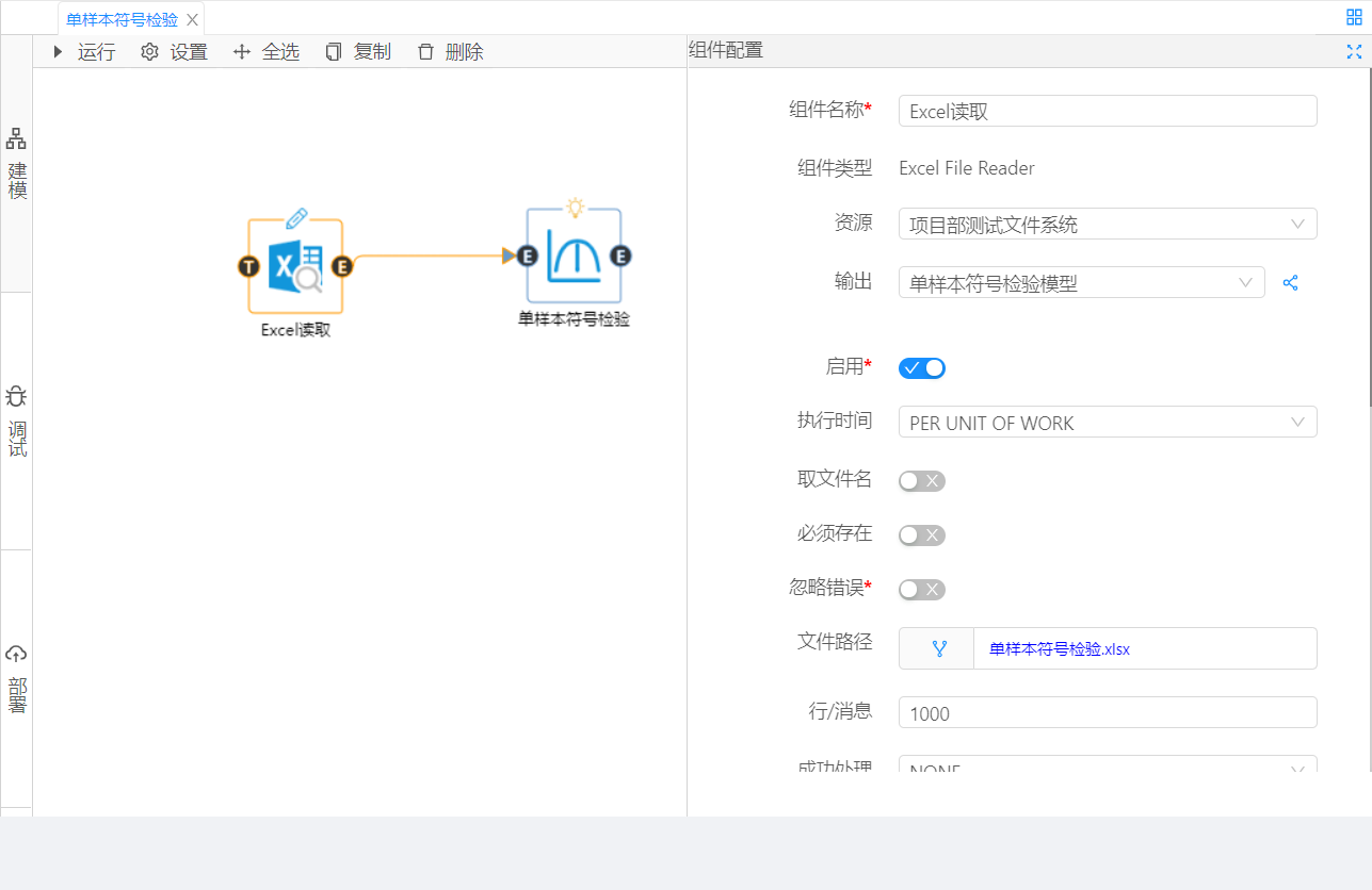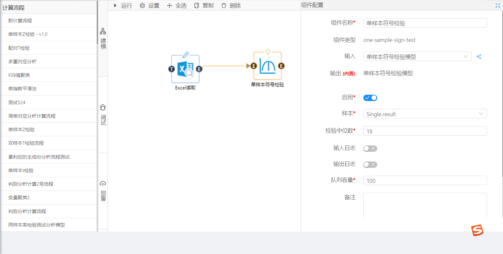 從數據大腦中的組件面板查找單樣本符號檢驗組件,拖動到工作面板,配置輸入、樣本、檢驗中位數、隊列容量。點擊運行,從調試中查看結果。