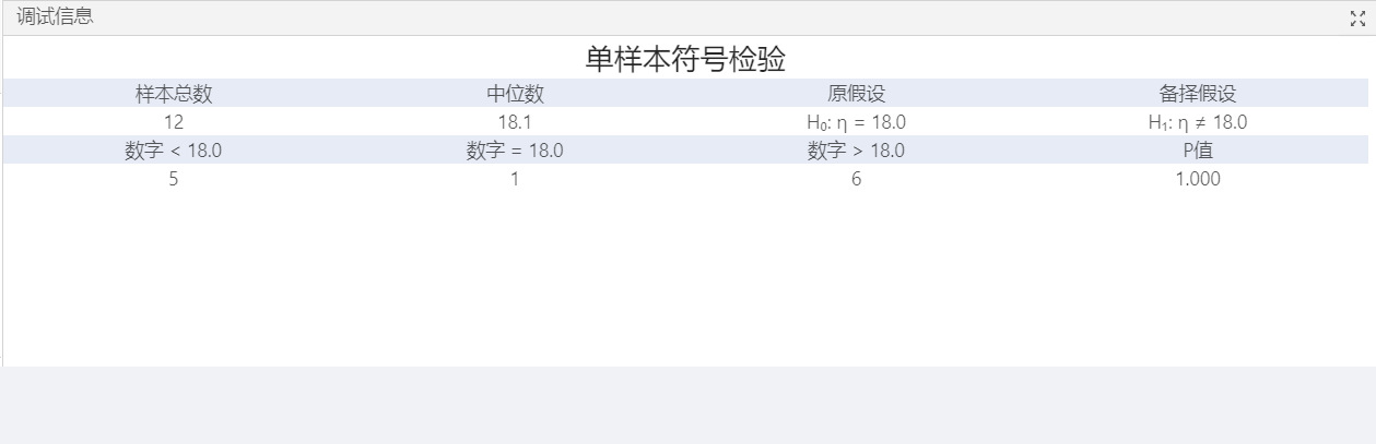 根據結果可以看到數據中一共有12個樣本,中位數為18.1。原假設的理想值為18,<18的有5個,>18的有6個,=18的有1個。由于p值為1(大于顯著性水平0.05),因此原假設成立。