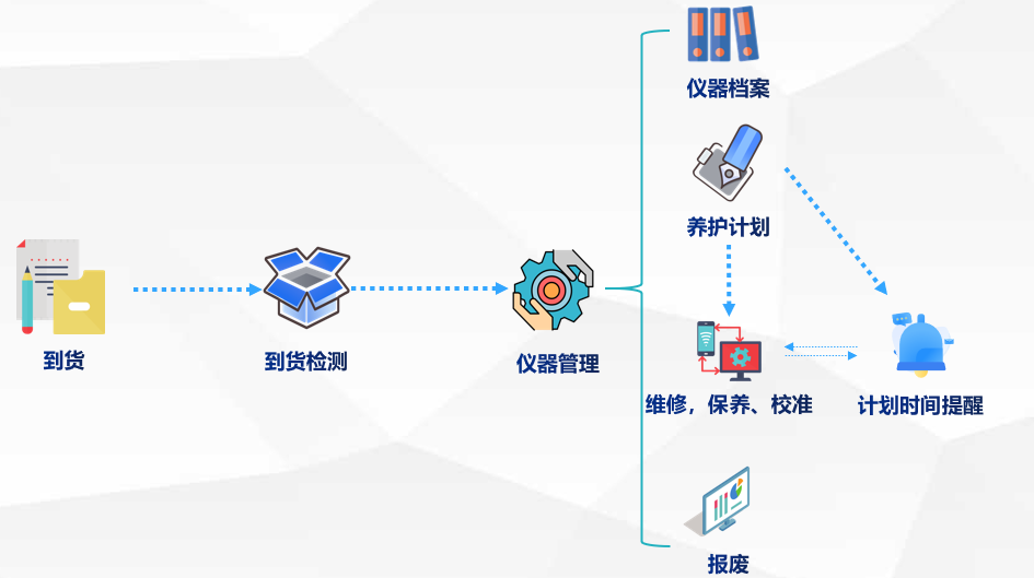 系統上線前,設備日常養護依賴紙質檔案、紙質維護單據,存在儀器未按照計劃養護、儀器數據追溯困難等情況。系統提供了儀器全生命周期的解決方案,從儀器到貨、到貨檢測,再到儀器檔案、養護、報廢全過程進行關聯,使得儀器管理全生命周期可追溯,管理者可以隨時掌握儀器養護情況;計劃時間提醒功能可以及時提醒工作人員對儀器進行養護。
