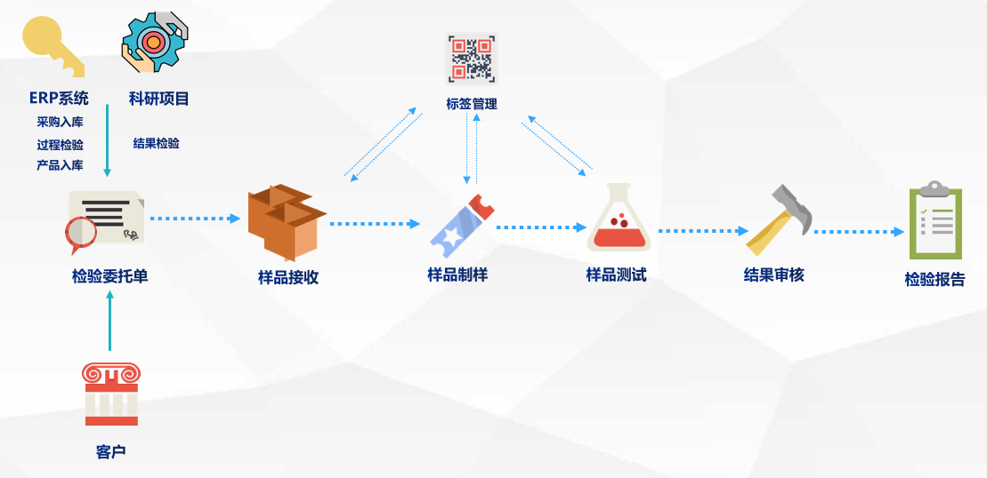 檢驗業務管理流程是實驗室的標準化流程,適合多數實驗室使用。樣品接收、樣品制樣、樣品檢測通過掃描標簽跟檢驗委托單關聯并獲取信息,使得業務數據可追溯并減少人工錄入過程,提高工作效率和避免失誤。